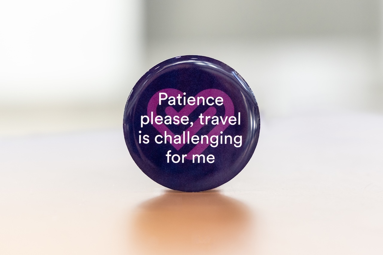 The simple but powerful message on the badge, “Patience please, travelling is challenging for me”, encourages understanding from fellow travellers by reminding people that kindness and patience can make a big difference.